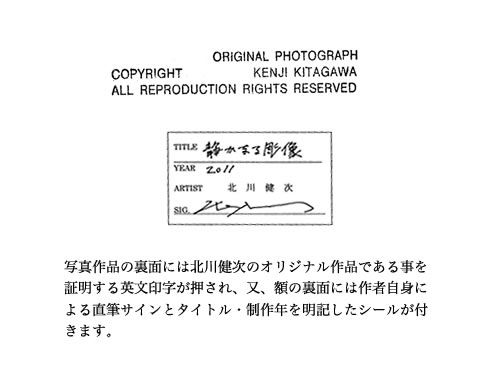 写真作品の裏面には北川健次のオリジナル作品である事を証明する英文印字が押され、又、額の裏面には作者自身による直筆サインとタイトル・制作年を明記したシールが付きます。